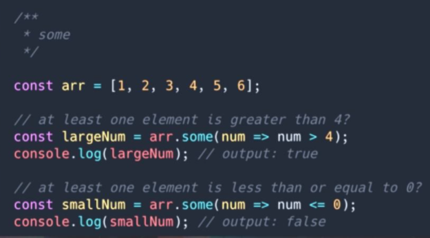El método some() verifica si algún elemento de array cumple con el test implementado por la función brindada. Si se prueba, devuelve «true» de lo contrario «false».